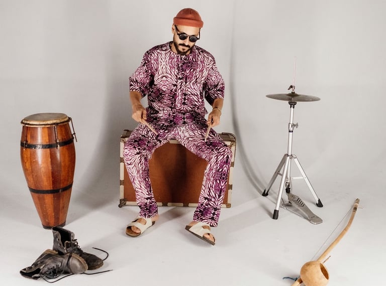 In this project, Thiago Trad performs with two other instrumentalists from the city where the performance takes place. The concept is for each show to be a unique encounter, bringing originality to the performances, connecting musicians and the audience in a shared vibration. The sound universe created by the beats crafted by Thiago Trad results in organic music that ranges from jazz to rock, with an experimental, visceral, and authentic approach. The musician brings to his repertoire beats rooted in Afro-Brazilian culture, connected with universal music. Ijexá, Cabila, Vassi, samba de roda, baião, and frevo are some of the rhythms that guide the music, which is created in real-time from the encounter between the musicians on stage.