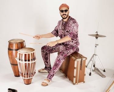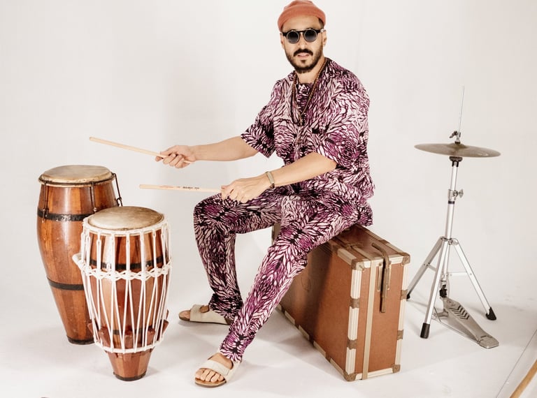 In this project, Thiago Trad performs with two other instrumentalists from the city where the performance takes place. The concept is for each show to be a unique encounter, bringing originality to the performances, connecting musicians and the audience in a shared vibration. The sound universe created by the beats crafted by Thiago Trad results in organic music that ranges from jazz to rock, with an experimental, visceral, and authentic approach. The musician brings to his repertoire beats rooted in Afro-Brazilian culture, connected with universal music. Ijexá, Cabila, Vassi, samba de roda, baião, and frevo are some of the rhythms that guide the music, which is created in real-time from the encounter between the musicians on stage.